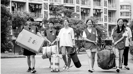 志愿者朱慧说:“新生报到的时候,就是学长学姐们帮我把行李搬送到寝室,这是入学后第一个让我感动的事情。这个场景,我现在都记得。现在,我也以同样的方式送别我的学长学姐,让他们开开心心地离校。”
